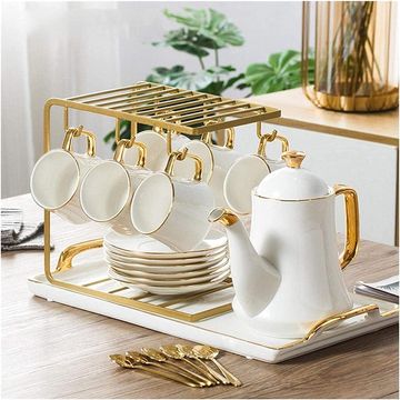 Conjuntos de chá da tarde com bule de chá de açúcar, jarra e bandeja de colheres de chá, suporte de caneca de metal, conjunto de xícaras e pires